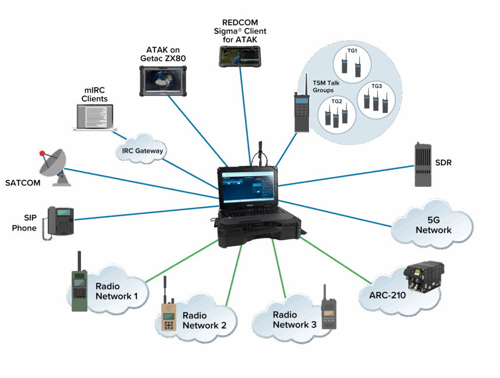 REDCOM STRIKE is a low-SWaP integrated communications hub for expeditionary forces. STRIKE consists of a ruggedized top-of-the-line Getac X600 Pro laptop running REDCOM Sigma, which unifies IP and RF communications across SATCOM, 4G/5G, MANET, and legacy radio networks, delivering an entire command center in one device.