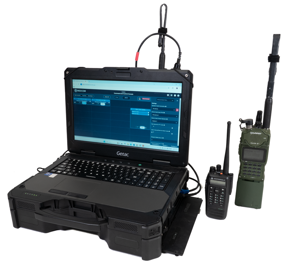 REDCOM STRIKE is a low-SWaP integrated communications hub for expeditionary forces. STRIKE consists of a ruggedized top-of-the-line Getac X600 Pro laptop running REDCOM Sigma, which unifies IP and RF communications across SATCOM, 4G/5G, MANET, and legacy radio networks, delivering an entire command center in one device.