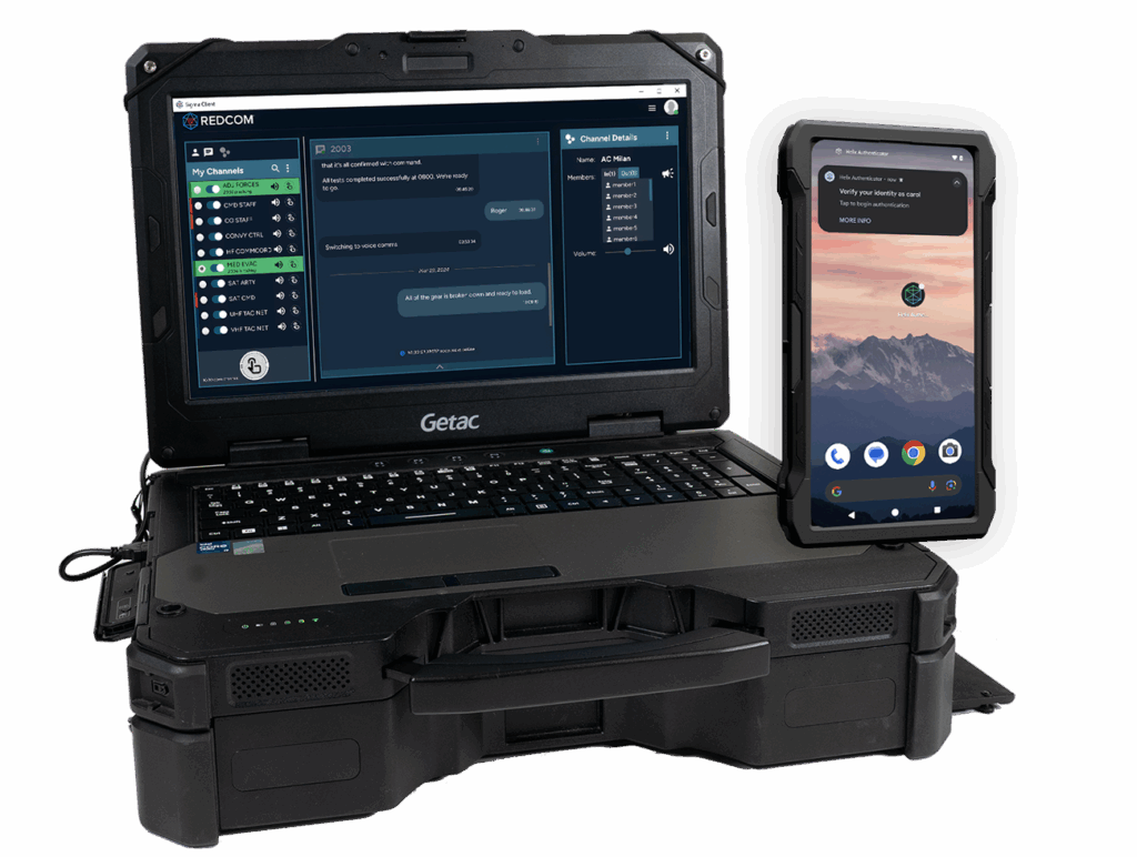 REDCOM STRIKE™ is a low-SWaP integrated communications hub for expeditionary forces. STRIKE consists of a ruggedized top-of-the-line Getac X600 Pro laptop running REDCOM Sigma, which unifies IP and RF communications across SATCOM, 4G/5G, MANET, and legacy radio networks, delivering an entire command center in one device.